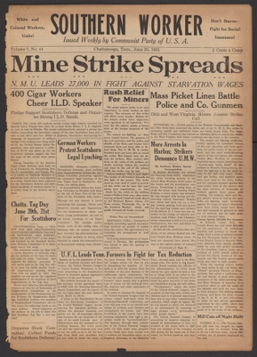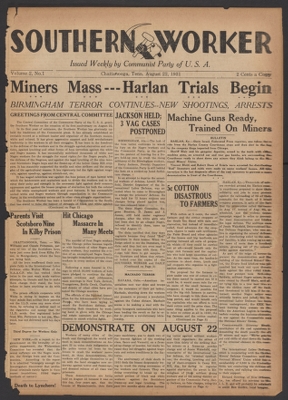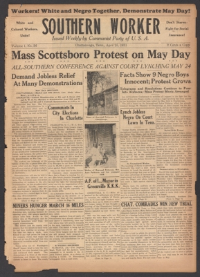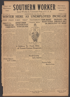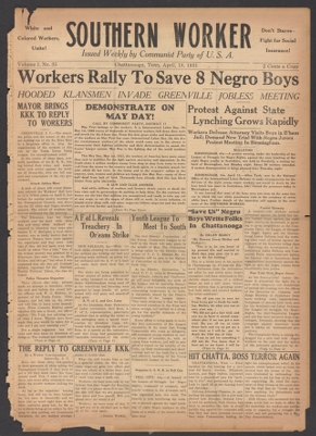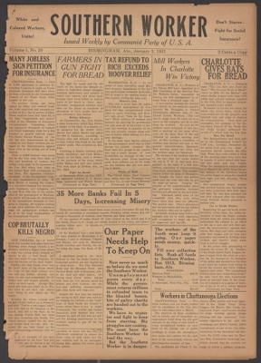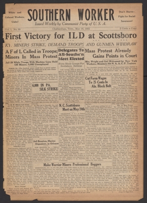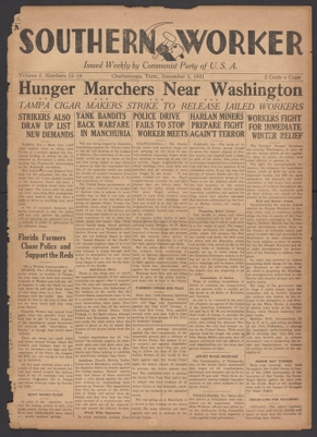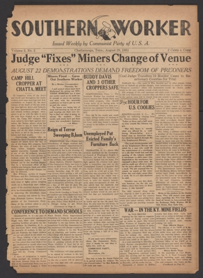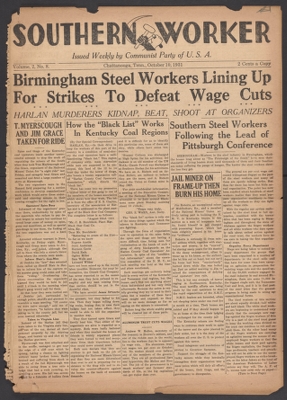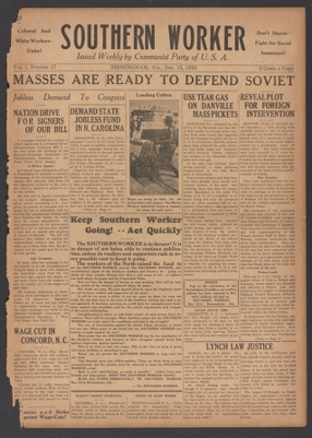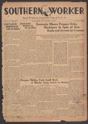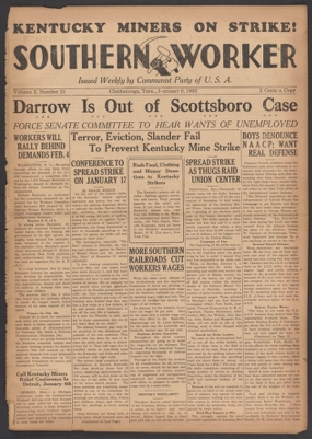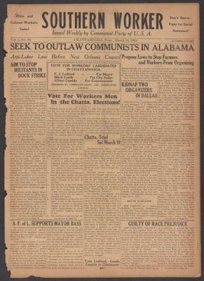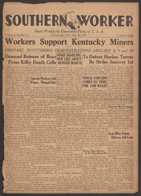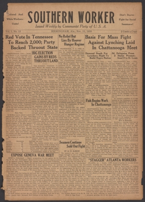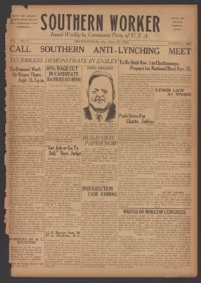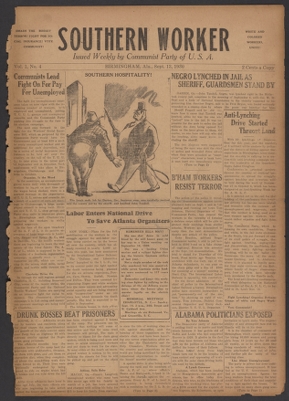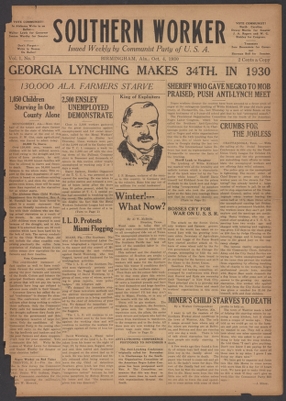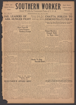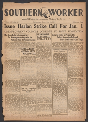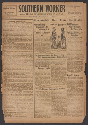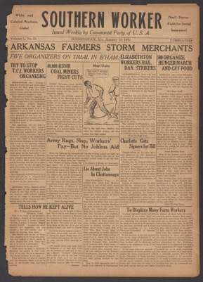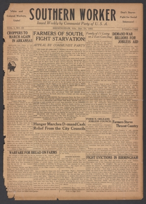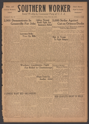 Distributed between 1930 and 1937, Southern Worker was a regional newspaper produced by the Communist Party, USA. First edited by Solomon "Sol" Auberbach, who adopted the pseudonym "James S. Allen," Southern Worker documents the Communist Party's attempt to unify Black and white laborers and farmers in a common struggle against capitalism, corporations, and inequality. READ MOREā¦
