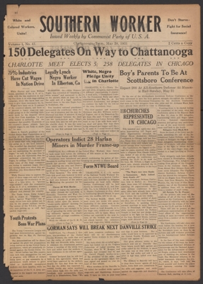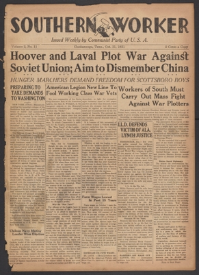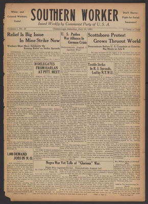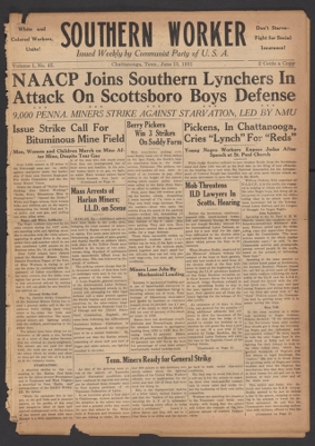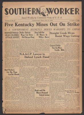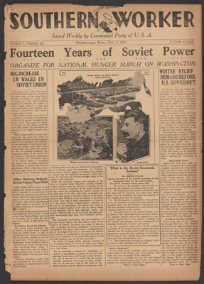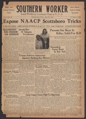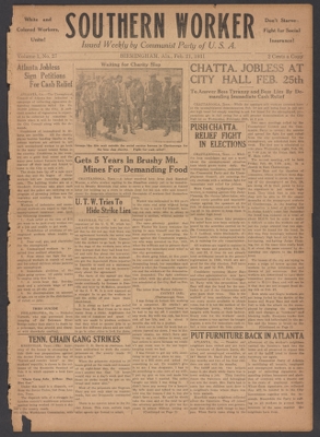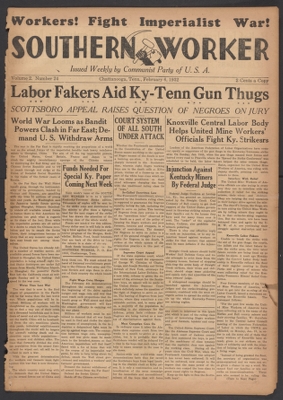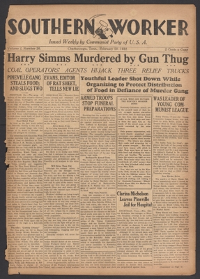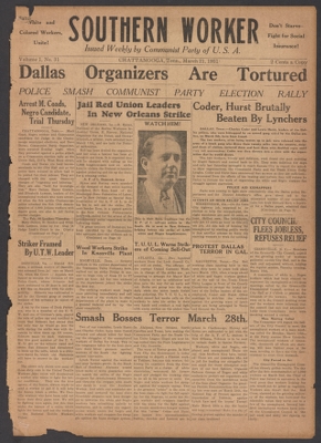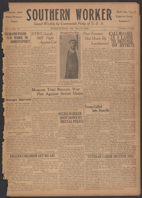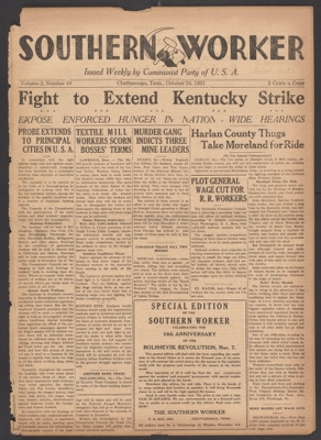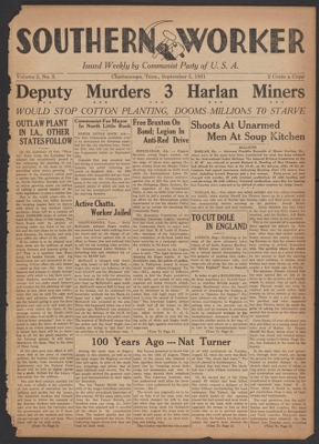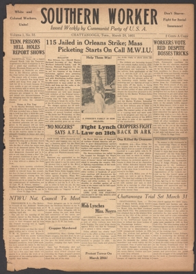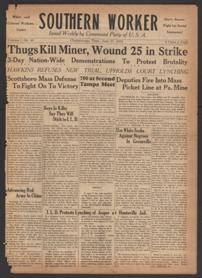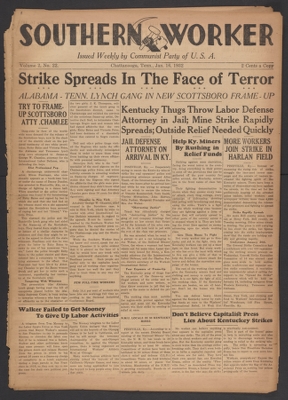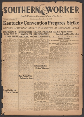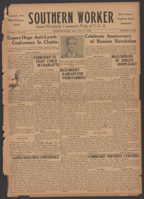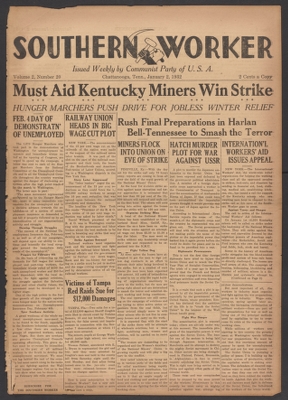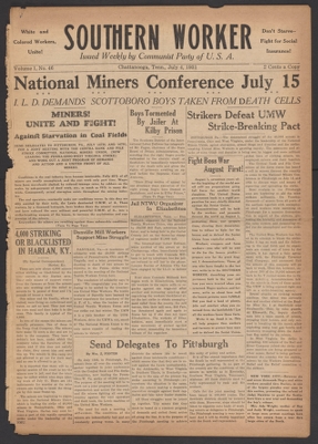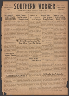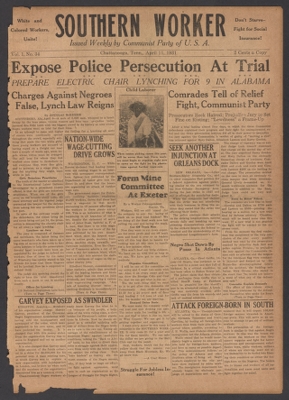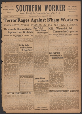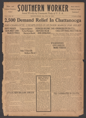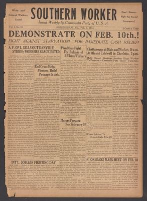 Distributed between 1930 and 1937, Southern Worker was a regional newspaper produced by the Communist Party, USA. First edited by Solomon "Sol" Auberbach, who adopted the pseudonym "James S. Allen," Southern Worker documents the Communist Party's attempt to unify Black and white laborers and farmers in a common struggle against capitalism, corporations, and inequality. READ MOREā¦