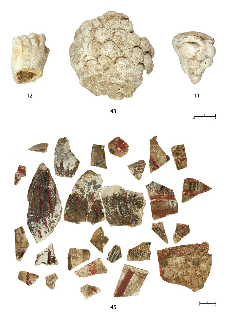 Description a cluster of 7 circular grapes with stem. On the back, possibly in the place of attachment, a textile impression. May have also been an architectural molding, a capital of a small column decorated with a bunch of grapes. Lower part fragmentary. Incomplete.