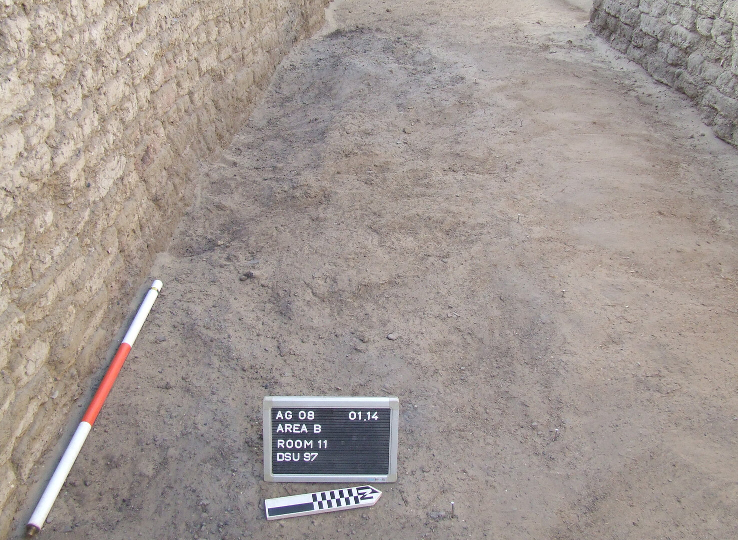 A north–south oriented barrel vault originally covered the room; substantial remains of both vault springs (BF101 and BF97) are still visible on the east and west walls. All walls are mud-plastered, as was the vault; their upper part is of a dark gray color, probably caused by cooking activities carried out inside the room. Four doorways originally opened onto room B10. One (BF120; width: 74 cm) was located near the west end of north wall BF106, but was later bricked in and plastered over (BF120). Two other doorways (BF113 and BF114), with an average width of 70 cm, are set along the west wall of the room and once led into spaces that were not objects of investigation. Both openings were found in extremely poor condition and modern wood lintels had to be placed in order to avoid the collapse of features. A fourth and larger (1.2 m wide) doorway (BF112), framed along its east side by a thick mud-brick stub, is located at the west end of south wall BF104 and opens onto an unexcavated area. None of the four doorways has preserved lintels (or clear sockets where these would have once been placed), so that their original height is very difficult to reconstruct.