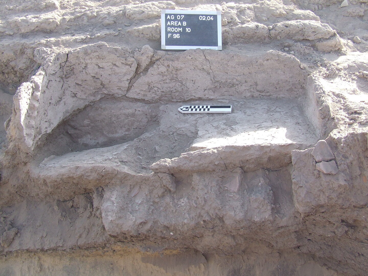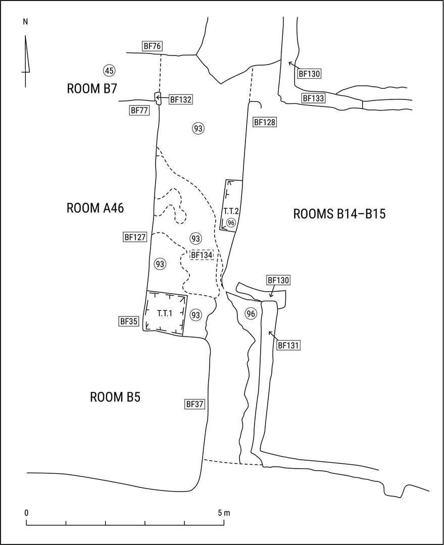 The uppermost floor (BF152; upper elevation: 112.930 m) was identified only in the northeast corner of the room and sloped from north to south. Below is BF153 (upper elevation: 112.660 m), a compacted mud floor whose remains extend over the entire eastern and central part of room B13.↩︎