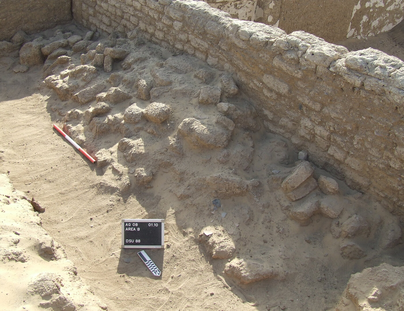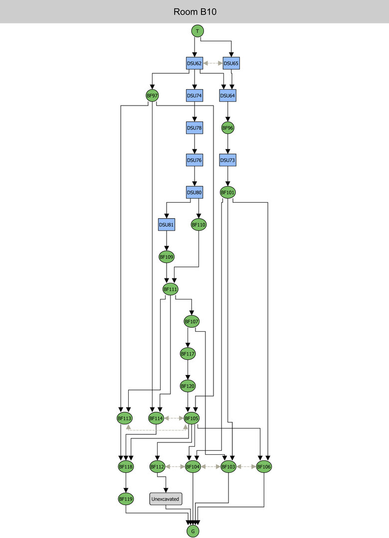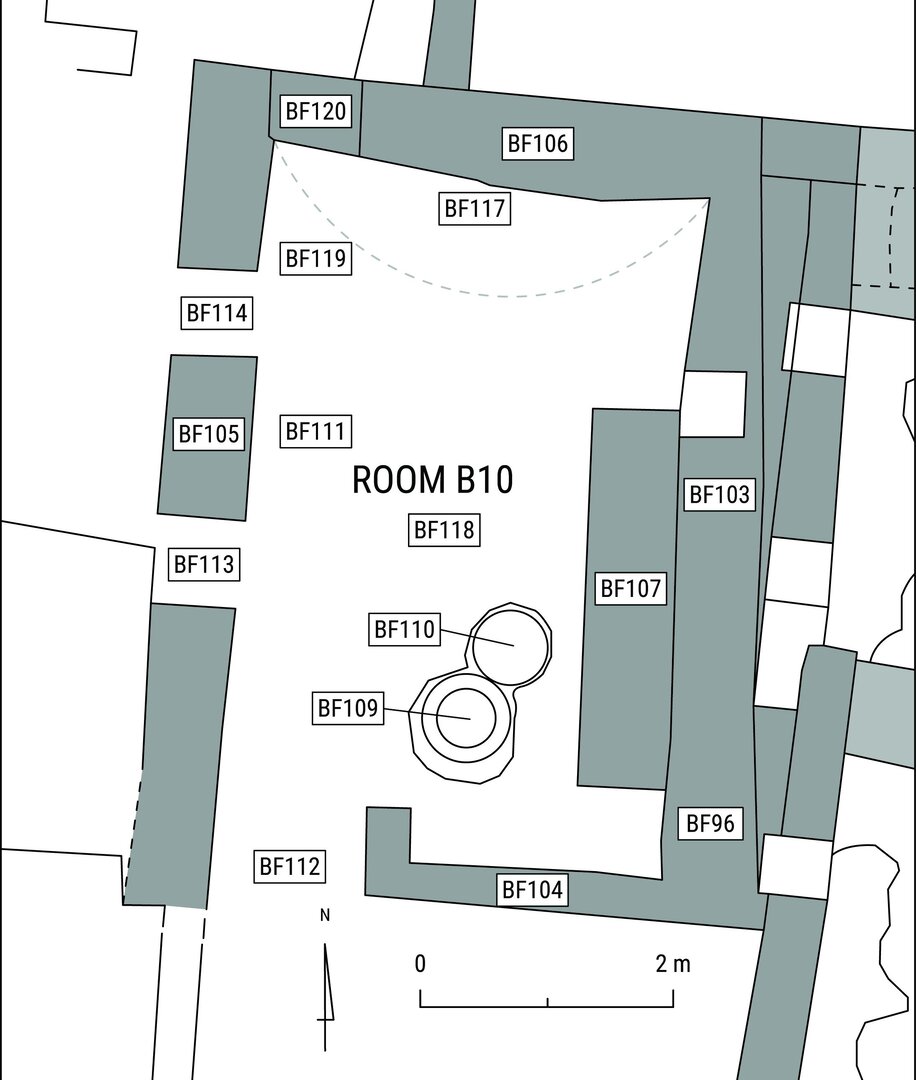 Room B10 went through several construction phases. The razed wall running from north to south was found below the earliest floor level and is therefore to be linked to an earlier building. The middle floor seems to have been used when the northern doorway was still open; after it was blocked, a third floor was laid, in phase with the three other doorways but preceding the damage that occurred to the east wall of the room and its restoration.