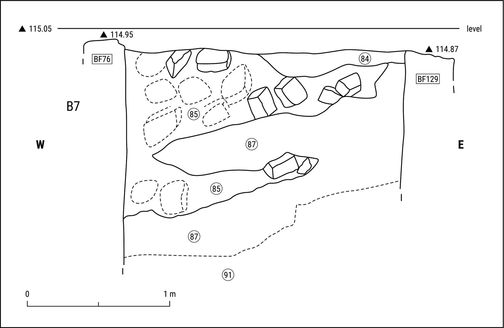 Upper elevation: 113.540 m; lower elevation: 112.790 m; max. thickness: 65 cm.↩︎