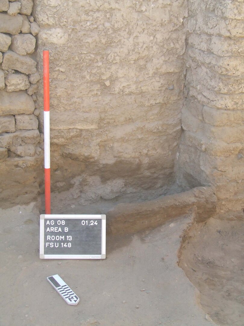 An arched niche is built within the south wall of the room, about 60 cm from its west end. It is 44 cm wide, 44 cm high, and 40 cm deep and has a semicircular band on top, recessed by ca. 4 cm. No traces of white gypsum plaster were found inside or around the niche, whose bottom part is heavily damaged and was likely the object of alterations already in antiquity. Another rectangular opening, ca. 80 cm wide and 70 cm high, was once set into the north wall of the room toward its eastern end, four courses above the latest floor level. At some point in antiquity, it lost its purpose and was completely bricked up (BF165). Room B14 possibly served, at least when it was roofed, as a storage facility for kitchen B15, before it was used, as mentioned above, as a domestic midden in its latest phase.