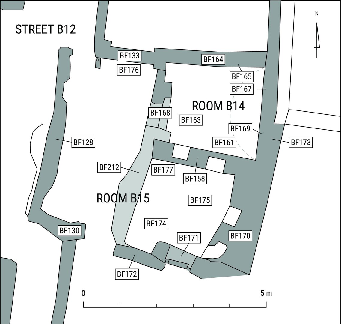 B14–B15 are a set of two interconnected spaces investigated to the east of street B12, in the vicinity of the entrance to the church complex (Plate 3.2; Plate 4.31, Plate 4.32). They are identifiable as a small open-air working area, possibly a kitchen/bakery (B15), furnished with a small storage area (B14).