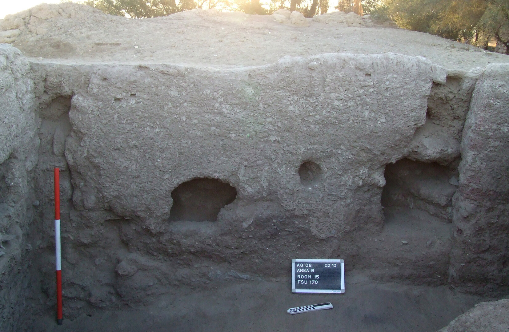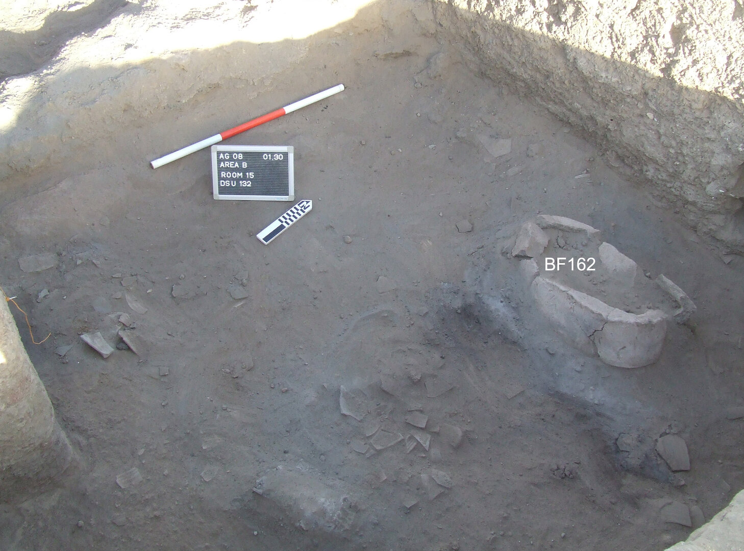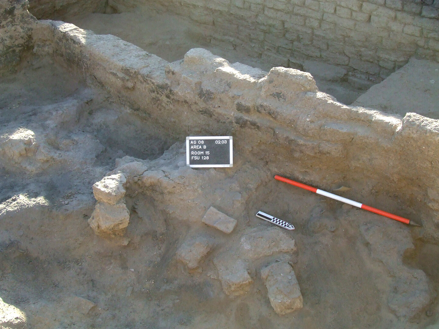 Possibly, three ovens were once located against the west wall and a fourth (BF176) against the west end of the north wall. The lack of almost any fragments of the pot chambers below the mud-brick rubble suggests that the ovens had already been largely dismantled when the west wall collapsed. The western sector of room B15 is physically separated from the southeast area of the same room by the scanty remains of a long north–south oriented wall (BF212), contemporary with the lowest floor (BF177) identified in this space. In fact, the southeastern sector might have originally been a separate space, but the presence of a floor level at a considerably higher elevation than the lowest floor (and less than 50 cm below the preserved top of BF212) suggests that this was not the case, at least in the latest occupational phase of this area. Toward its northern end, wall BF212 abuts the south wall of room B14 and forms part of the west boundary of that room. Within room B15, it seems to have been utilized, at least at a later stage, to define the eastern edge of the platform where the ovens were located. The wall continues southward into an unexcavated area and is possibly the remainder of an earlier feature that was partially reused when the platform with the ovens was built.