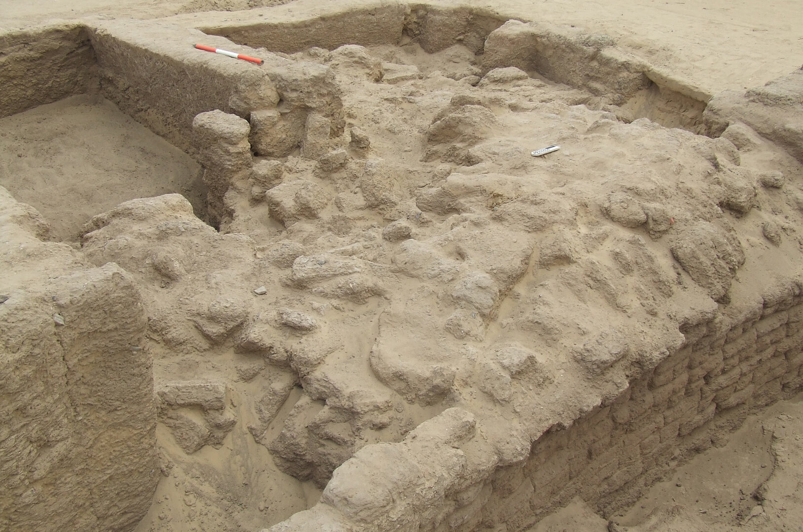 The corridor is in a fairly good state of preservation, although bearing traces of damage caused by termites. Mud bricks were used for the construction of the walls, laid out in English bond with just a few anomalies in some courses. Three small holes were noticed along the east sector of the north wall and two along the east sector of the south wall; their origin and/or possible function was not ascertained beyond doubt. Signs of wear are visible along the north wall, due either to natural erosion or to the friction caused by the passage of small carts. A floor (BF141)15 made of compacted mud, with several organic inclusions and small pottery fragments, was found in a fairly good state of conservation below layers of sand, organic deposits, and ash. It gently slopes down from west to east, where it intersects street B12 and courtyard B13. The presence of animal coprolites and signs of wear along corner walls suggest that the passageway was accessible not only to people but also to animals and carts.16