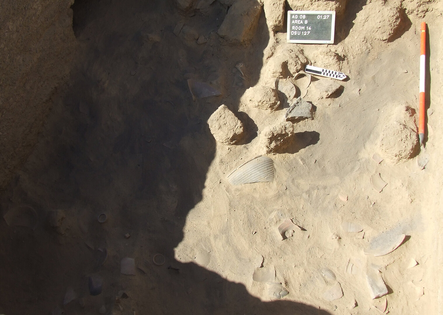 DSU129 rested in part above the remains of substructures, visible along the western and northern walls of the room, that once hosted clay ovens. A few traces of the original pot chambers were found scattered throughout this area. Within the remains of an oven placed against the north wall, the removal of a deposit of soft brown sand (DSU134)86, with a few pebbles and limited organic inclusions, revealed a lower layer of dark brown/grayish ash (DSU135)87, which contained pockets of soil of different colors (dark brown soil with organic inclusions; fine, light gray ash; reddish brown clay, likely debris from the oven). DSU129 was identified also in the southeastern part of room B15, beyond the mud-brick platform and thus in an area that seems to have differed, from a functional point of view, from the rest of room B15.