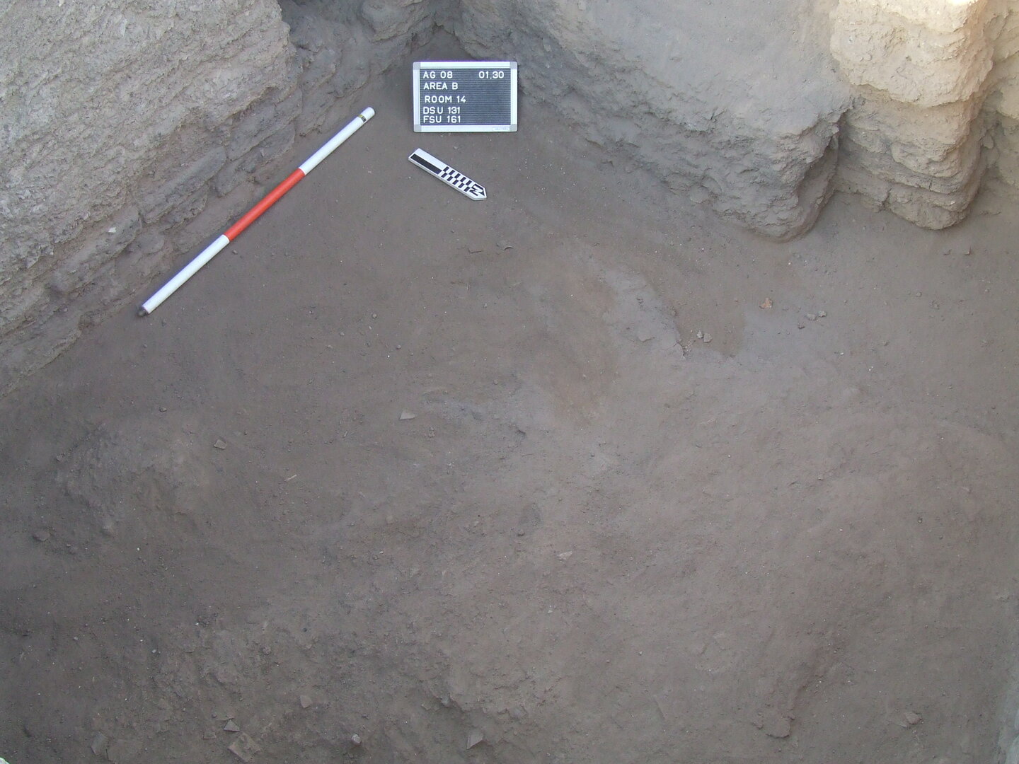 BF161 (upper elevation: 112.920 m) is the higher floor level, slightly sloping down eastwards. BF163 (upper elevation: 112.750 m) was exposed in a test trench dug in the western half of the room, along the east side of the doorway.↩︎