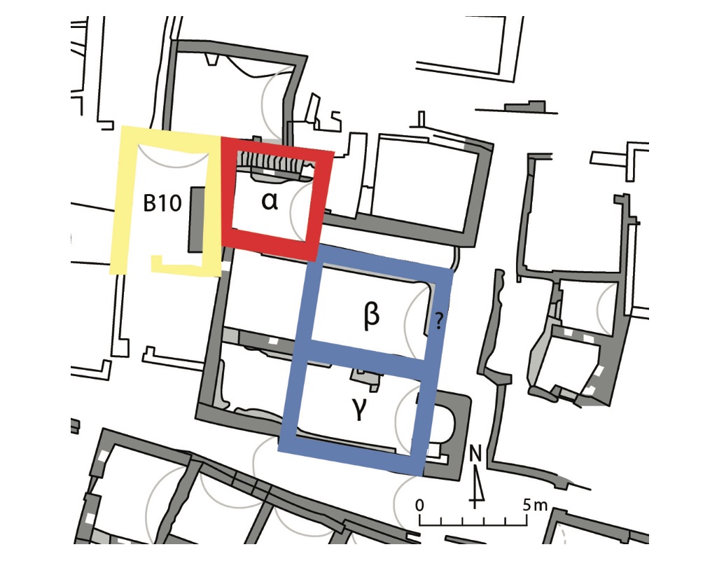 Rooms α, β, and γ were substantially altered when the church complex was created in its full extent, involving the enlargement of rooms β and γ to the west and the addition of rooms B6–B9 to the north. The east wall of room α, bonded with the north wall of β, was partially demolished and a doorway (BF89) opened onto corridor B7.3 The latter was created through the addition of an east–west wall (BF76) parallel to the north wall of room β, which was also subject to substantial alterations in its north face at this stage.