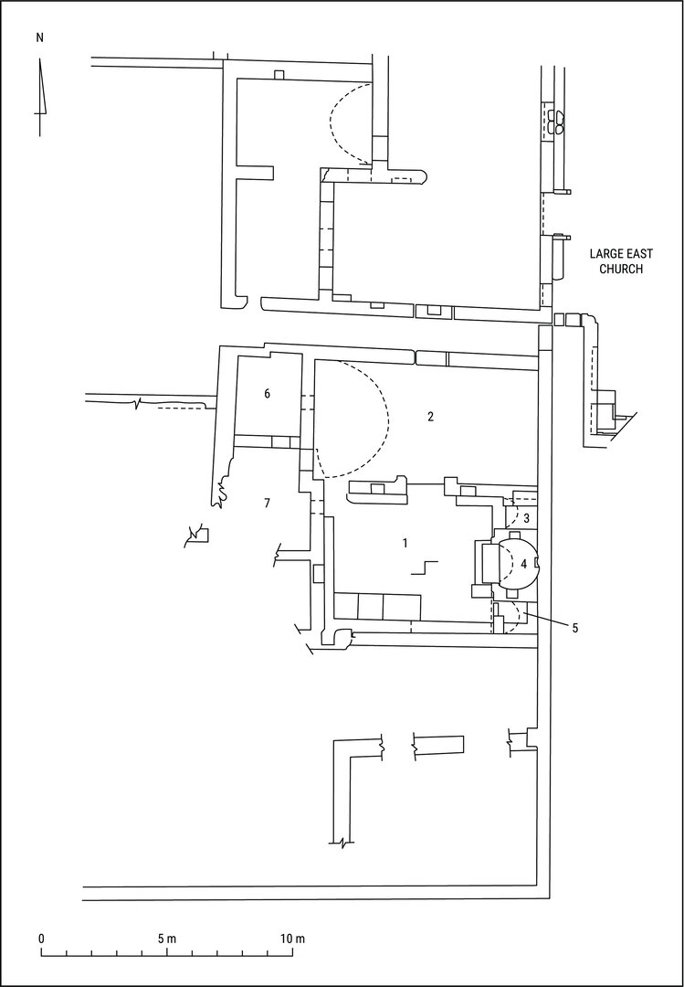 An intriguing question concerns the nature of rooms β and γ before their alteration into rooms B5 and A46, i.e., if they functioned as a church before their expansion to the west and the addition of an apsidal sanctuary. In the first centuries of Christianity, the common worship and the liturgies were carried out in buildings of a domestic nature, with the basilica form being adopted in Christian architecture around the time of Constantine.11 There is evidence for the existence of such domus ecclesiae in the ancient world, with the best known example coming from Dura Europos.12 The possibility that religious ceremonies were carried out in rooms β and γ prior to their enlargement and/or the construction of the apse cannot be ruled out, but there are no available archaeological data to support it.