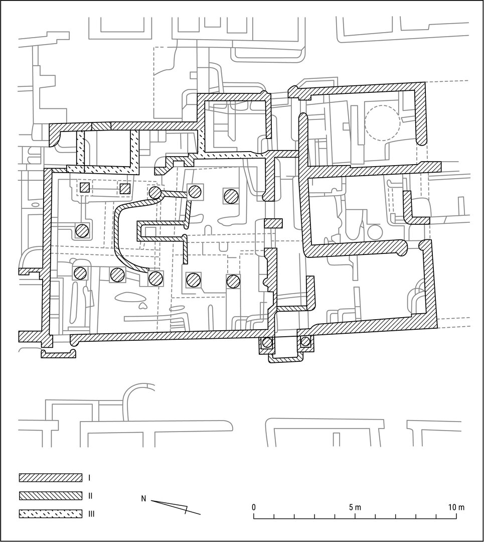 Evidence was collected that testifies to the existence of buildings pre-dating the church and the set of interconnected rooms to the north. The walls of these structures were, as mentioned above, either razed or incorporated within the walls of the church complex. According to the available data, it was possible to identify at least three rooms in the area later occupied by rooms B5, B6, and A46 (Plate 5.1).1