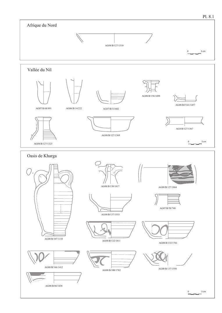 Selon P. Ballet, ce groupe serait plutôt originaire de l’oasis de Kharga, éventuellement de la partie nord de cette oasis et notamment de l’atelier de Ta ‘un al-Hawa situé au nord de l’actuelle ville de Kharga.30 Il est intéressant de constater que le même duo, bouteilles et écuelles, se rencontrent sur d’autres sites tel Kysis.31 Enfin, une bouteille oasite ou une imitation a été découverte sur le site de l’Agora d’Athènes,32 attestant soit de la valeur des vins de Kharga ou du voyage d’un oasite en Grèce.33