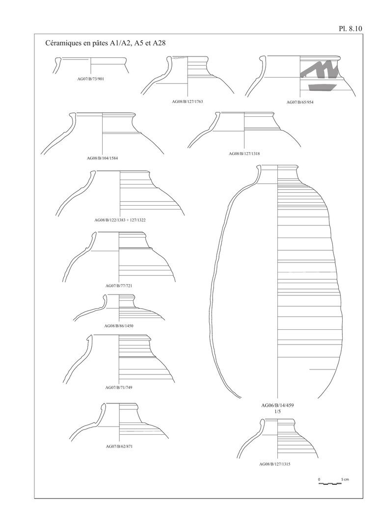Dans le tableau de comptage a été rajouté, afin d’appréhender le plus précisément possible le NMI, 1 filtre en pâte B10 ce qui explique la présence de 3 fragments et d’un NMI de 2 gargoulettes en pâte B10. Nous avons également indiqué la présence d’1 panse d’une grande jarre de stockage à décor peint qui représente 1 individu.↩︎