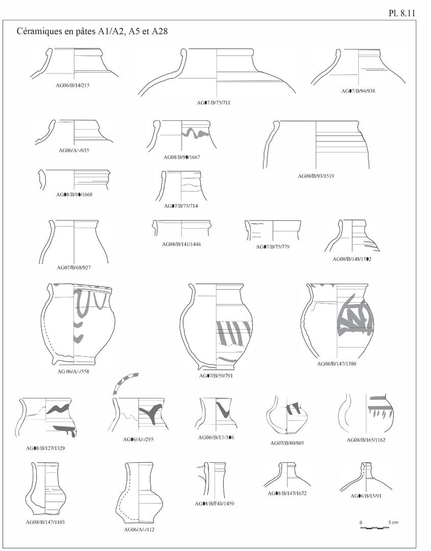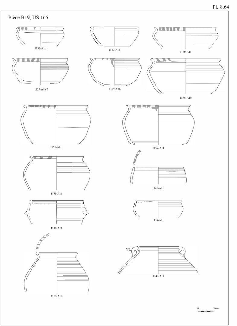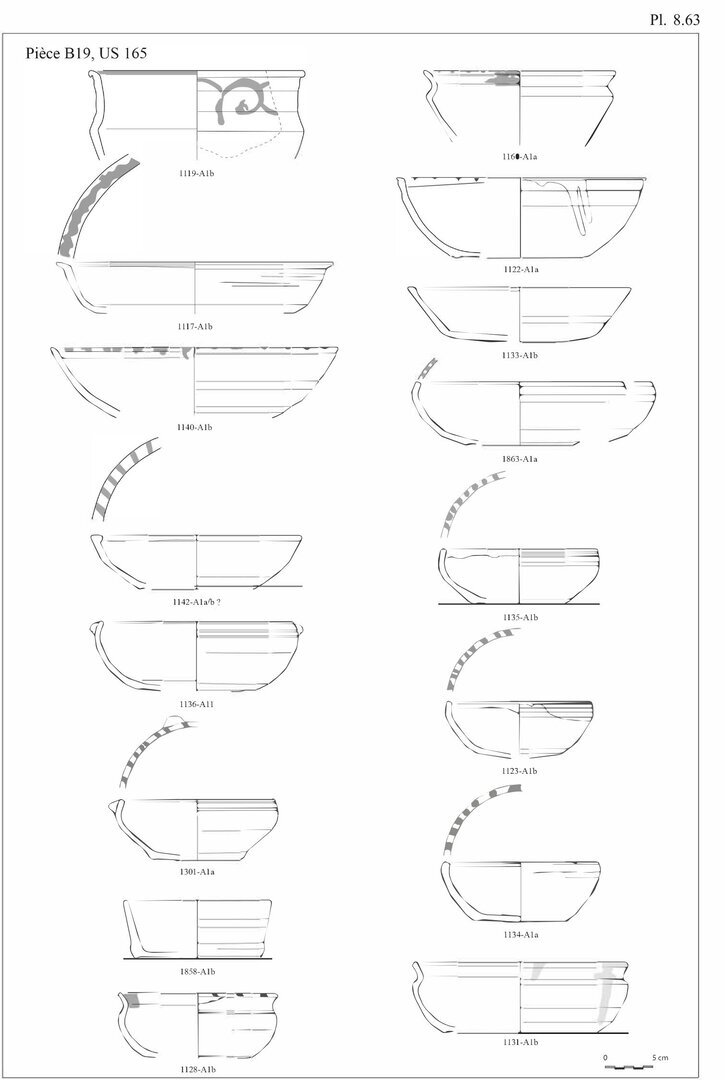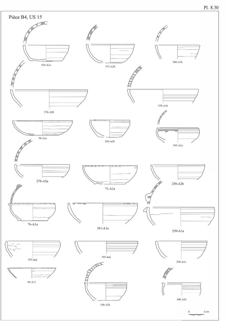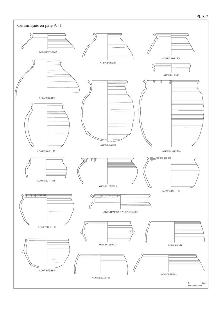 En ce qui concerne les bols en pâte A11, nous avons choisi d’indiquer 20 individus au lieu des 29 fonds. En effet, ces fonds peu caractéristiques peuvent également être associés aux pots globulaires, éventuellement aux casseroles.↩︎