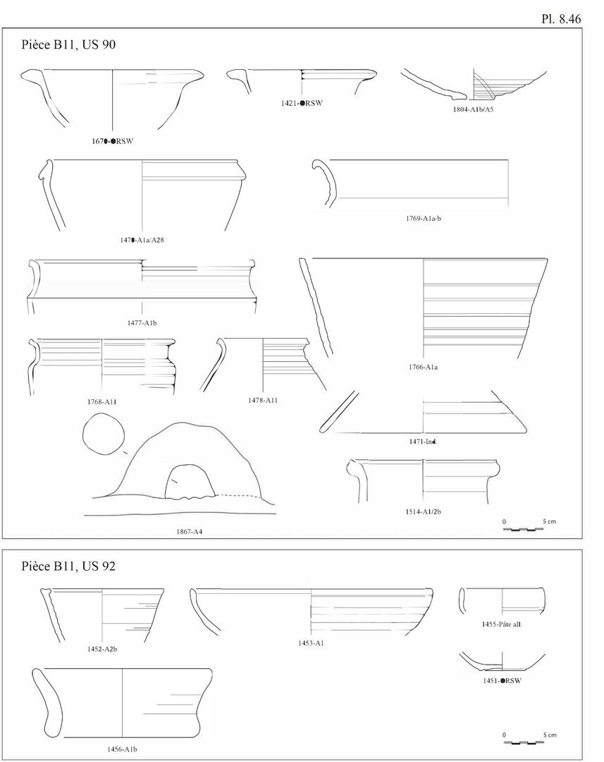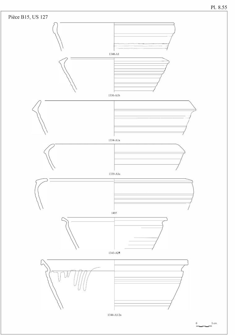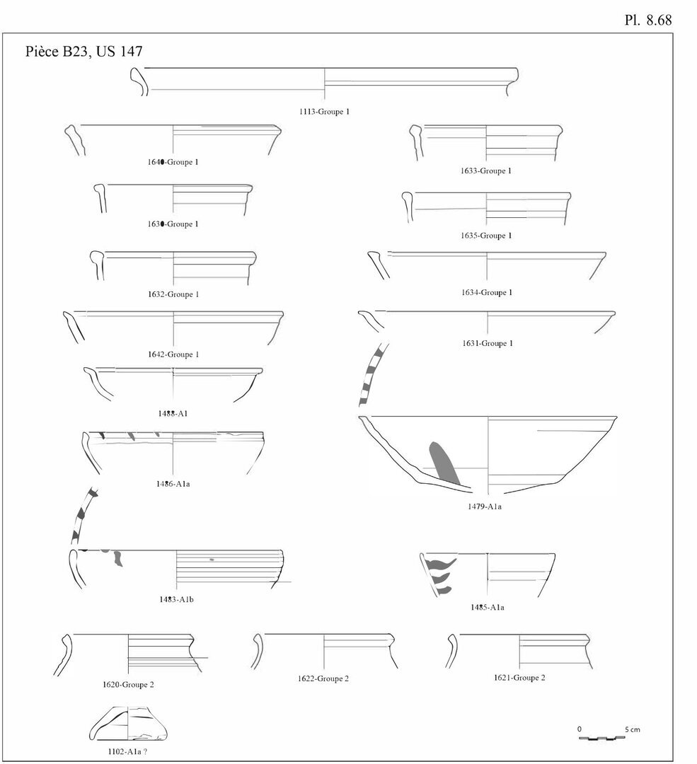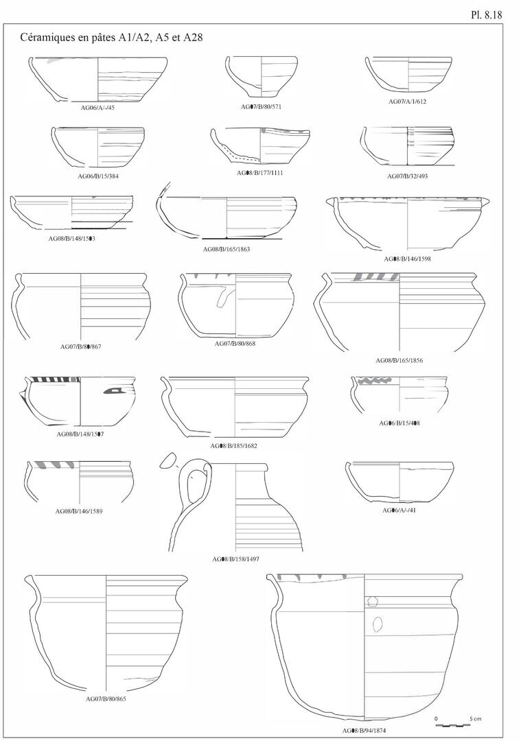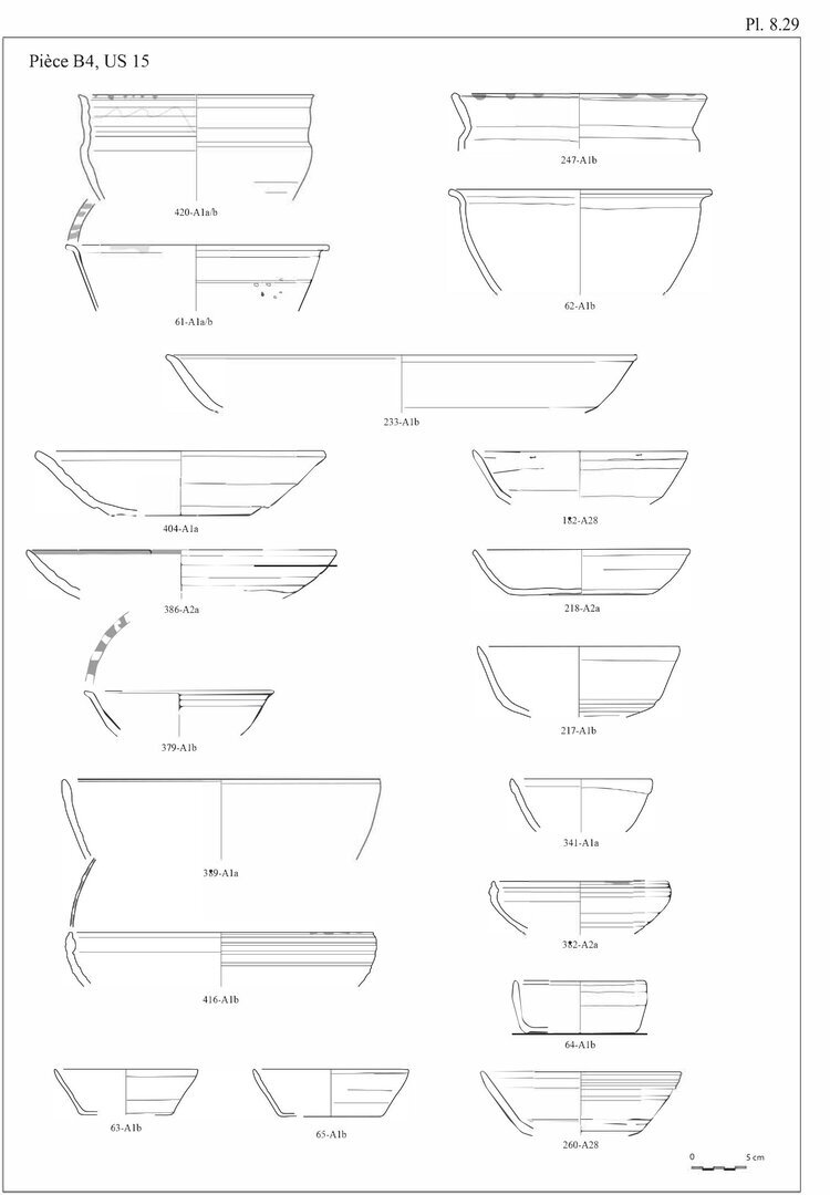 En ce qui concerne les bols en pâte A11, nous avons choisi d’indiquer 20 individus au lieu des 29 fonds. En effet, ces fonds peu caractéristiques peuvent également être associés aux pots globulaires, éventuellement aux casseroles.↩︎