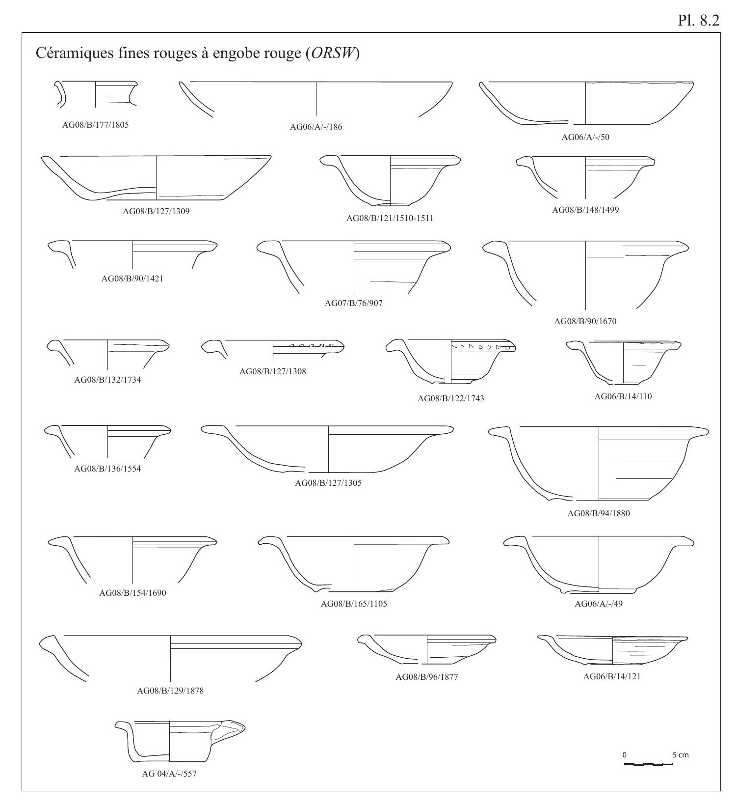 Le classement des céramiques découvertes sur le site d’ʿAin el-Gedida ne suit pas les principes adoptés pour la présentation des céramiques découvertes sur le site d’Amheida (bâtiment B2);17 ce catalogue suivait alors un schéma chronologique et fonctionnel. En effet, le matériel découvert à ʿAin el-Gedida permet une approche différente en raison de l’homogénéité chronologique et typologique de l’ensemble et par la présence d’un groupe clairement de production locale. Ainsi, le répertoire morphologique s’organisera de la façon suivante:18