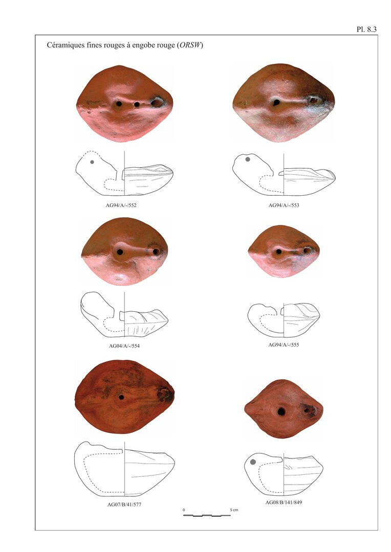 La grande majorité des céramiques a été façonnée au tour ce dont témoignent les traces de tournage encore visibles sur ces céramiques.9 Seules deux catégories de céramiques ont été moulées: les lampes dont les traces attestent l’usage de deux valves fixées au moyen de barbotine et les céramiques à pâte rouge et engobe rouge (ORSW). Enfin, les céramiques du type dokkas, larges bassines et/ou mangeoires ont été façonnées à la main et probablement montées au moyen de la technique du colombin.