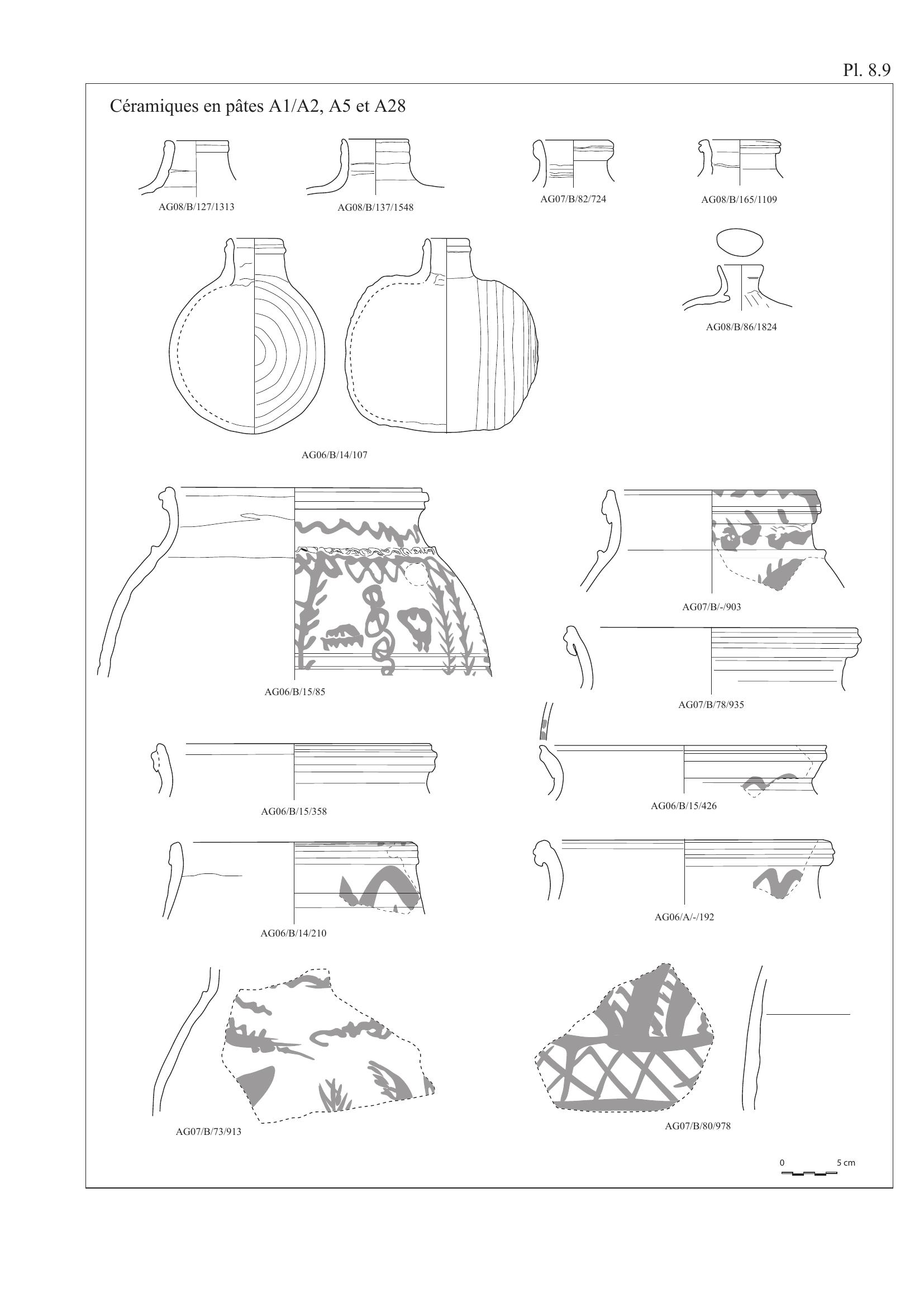 Le répertoire morphologique lié à ce groupe comprend deux formes principales présentant généralement un décor peint.29 (Plate 8.1). La première forme est celle des amphores de table à panse cylindrique, fond annulaire et pourvues de deux anses; la panse est fréquemment ornée d’un riche décor peint sur un engobe jaune. La seconde forme est celle des écuelles à fond plat et parois obliques dont l’intérieur présente un décor d’entrelacs rouges également peint sur un engobe blanc à jaune. On signalera que les bouteilles étaient sans doute réservées au transport et au conditionnement de vin, ce dont pourraient témoigner les résidus de poix encore visibles sur les parois de certains exemplaires.